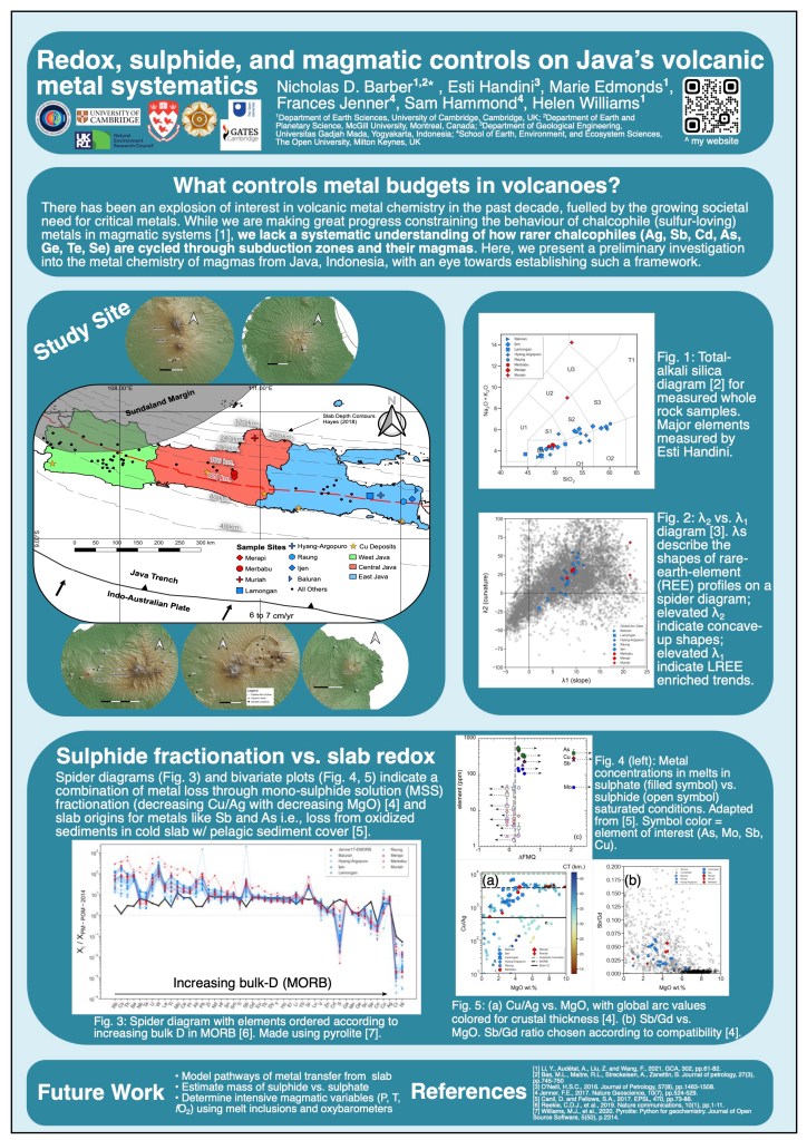 I am leading a regional survey of magmatic chemistry in volcanoes across Java, Indonesia. This work combines textural, microanalytical, and isotope analyses in melt inclusions, individual minerals, and whole rock, to better constrain 1) the timing of sulphide vs. vapor saturation in magmas and 2) the optimal tectonic conditions for crustal Cu deposition. I developed this project in partnership with Universitas Gadjah Mada researchers based in Yogyakarta, ID. See this poster (right), which I presented at the fO2 international school in September 2022, for progress on this work