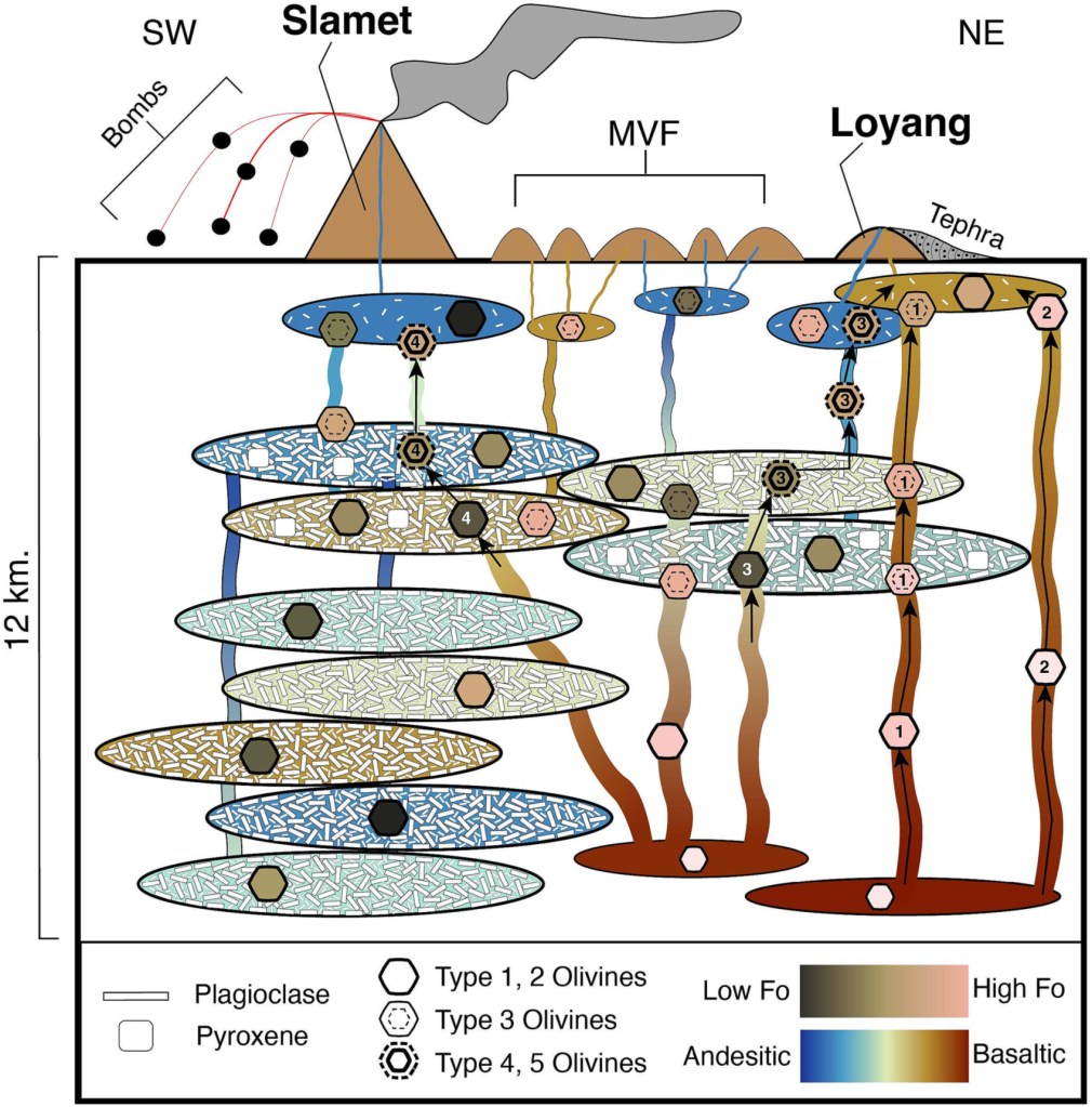 Slamet volcano in Central Java is one of the most active volcanoes in Indonesia. Its main edifice is defined by Strombolian eruptions, and on its eastern flank 30+ scoria cones. We have closely studied the erupted products of Slamet and Gunung Loyang, the most distal scoria cone on Slate’s flank, to understand the lateral and vertical scales of magma mixing within this volcanic complexes magma mush.